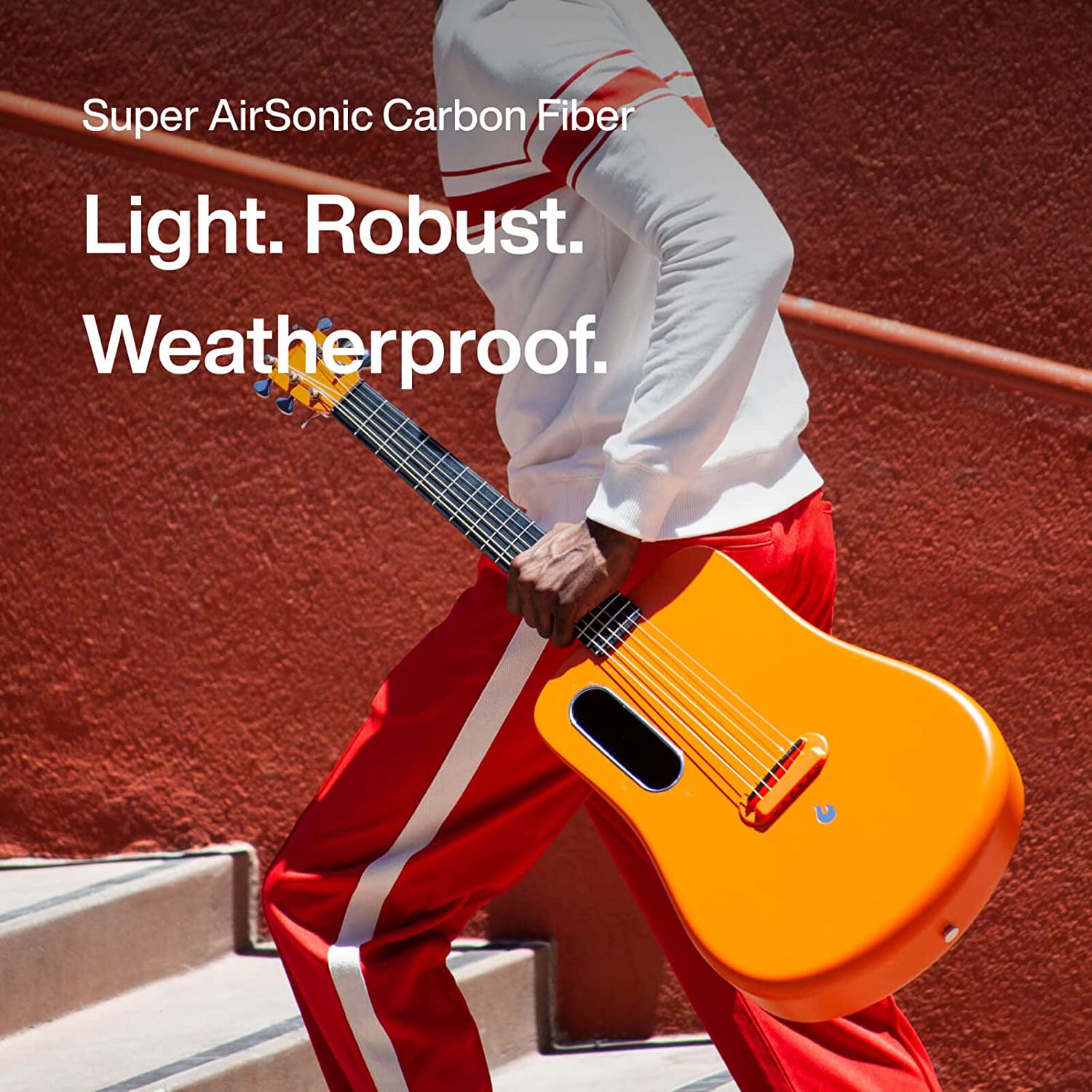 Cấu trúc sợi carbon AirSonic đúc phun có khả năng chống chịu cực tốt với các yếu tố và có thể chịu được nhiệt độ từ -20 đến +90 °C và độ ẩm lên tới 90% – điều không tưởng đối với một cây đàn guitar làm từ gỗ truyền thống. Mặt trên cực kỳ mỏng và cộng hưởng, với lỗ thoát âm ở phía dây bass, điều này đảm bảo âm thanh được phát ra rõ ràng. Đây cũng là vị trí bạn sẽ tìm thấy cổng USB, micrô để chọn các kỹ thuật chơi bộ gõ và công tắc để điều chỉnh các hiệu ứng như chorus và delay effect. Mặt khác, điều chỉnh hiệu ứng effect nằm ở phía trên cùng, tiếp đó đến reverb và phía dưới cùng là điều chỉnh volume. Và bởi vì công nghệ Freeboost biến mặt sau của thân đàn thành loa, bạn có thể nghe thấy các hiệu ứng ngay cả khi không kết nối với bộ khuếch đại.